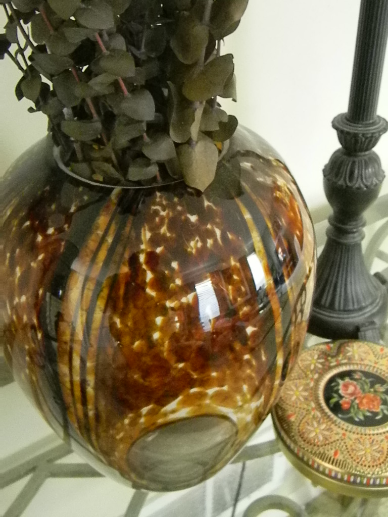 Now that fall is officially here it's time to add a few warm touches around the house. No need to break the bank. Take a trip to the dollar store, outside to the yard or certainly to craft stores and you will find plenty to inspire you. Hobby Lobby, Michael's and JoAnn's Fabrics are always having sales. I've had this beautiful tortoise shell vase for years. I just added a few packages of Eucalyptus stems that I picked up at the local dollar store for, of course $1 a piece, and it's an instant update for my console.